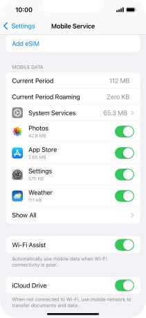 Press the indicator next to "Mobile Data" to turn the function on or off.