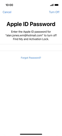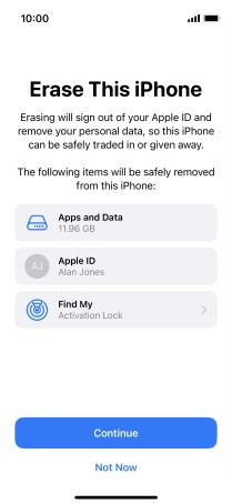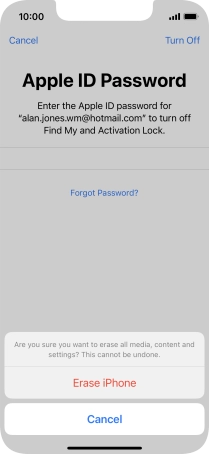Key in the password for your Apple ID and press Erase iPhone. Wait a moment while the factory default settings are restored. Follow the instructions on the screen to set up your phone and prepare it for use.