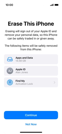 Key in the password for your Apple ID and press Erase iPhone. Wait a moment while the factory default settings are restored. Follow the instructions on the screen to set up your phone and prepare it for use.