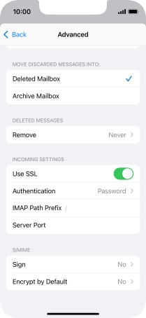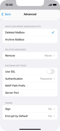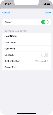 Press the indicator next to "Use SSL" to turn the function on or off. Please note that if you're using Vodafone's outgoing server, turn off SMTP authentication and leave the username and password fields empty.