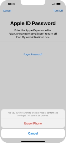 Key in the password for your Apple ID and press Erase iPhone. Wait a moment while the factory default settings are restored. Follow the instructions on the screen to set up your phone and prepare it for use.