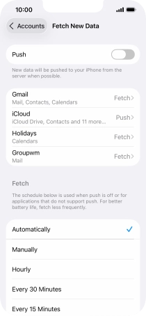 Press the required email account and follow the instructions on the screen to select settings for the specific account.