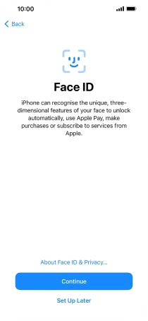 Follow the instructions on the screen to turn on use of Face ID or press Set Up Later.