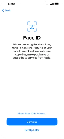 Follow the instructions on the screen to turn on use of Face ID or press Set Up Later.