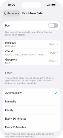 Press the required email account and follow the instructions on the screen to select settings for the specific account.