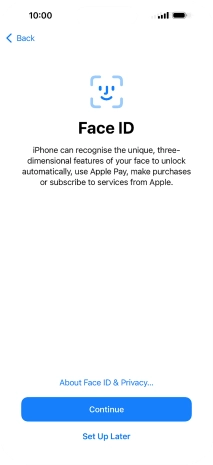Follow the instructions on the screen to turn on use of Face ID or press Set Up Later.