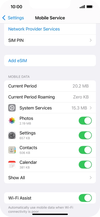 Press the indicator next to "Mobile Data" to turn the function on or off.