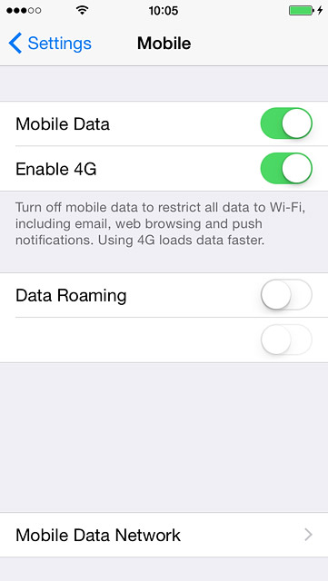 Press the indicator next to "Mobile Data" to turn the function on or off.