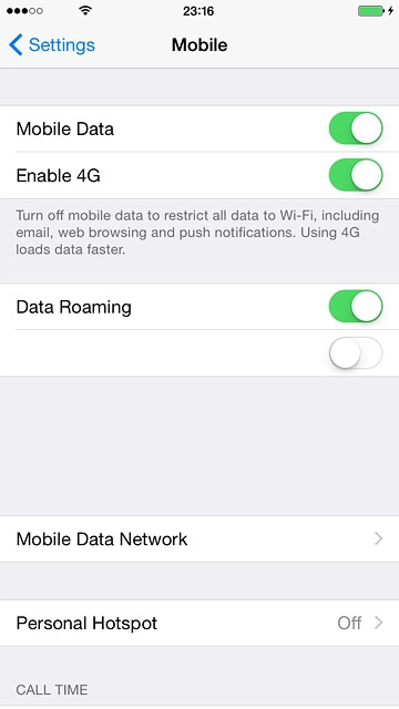 Press the indicator next to "Mobile Data" to turn the function on or off.