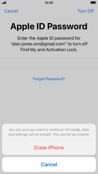 Key in the password for your Apple ID and press Erase iPhone. Wait a moment while the factory default settings are restored. Follow the instructions on the screen to set up your phone and prepare it for use.