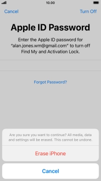 Key in the password for your Apple ID and press Erase iPhone. Wait a moment while the factory default settings are restored. Follow the instructions on the screen to set up your phone and prepare it for use.