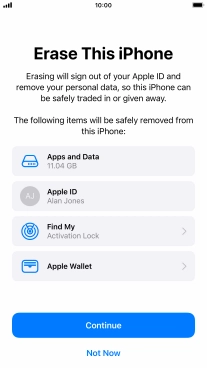 Key in the password for your Apple ID and press Erase iPhone. Wait a moment while the factory default settings are restored. Follow the instructions on the screen to set up your phone and prepare it for use.