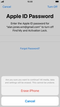 Key in the password for your Apple ID and press Erase iPhone. Wait a moment while the factory default settings are restored. Follow the instructions on the screen to set up your phone and prepare it for use.