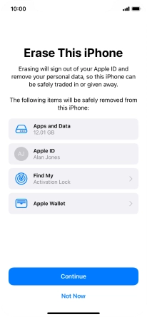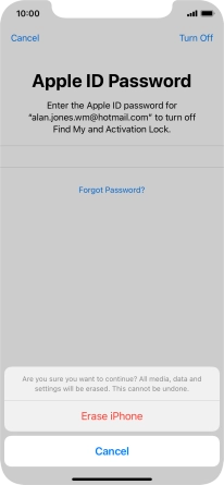Key in the password for your Apple ID and press Erase iPhone. Wait a moment while the factory default settings are restored. Follow the instructions on the screen to set up your phone and prepare it for use.