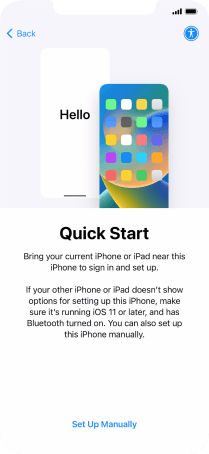 Follow the instructions on the screen to transfer content from another device running iOS 11 or later or press Set Up Manually.