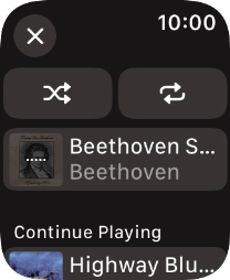 You can use the music player to play audio files you've synchronised with your Apple Watch. To use the music player, you need to establish a connection to a Bluetooth headset.