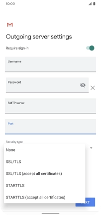 Press the indicator next to "Require sign-in" to turn the function on or off. Please note that if you're using Vodafone's outgoing server, turn off SMTP authentication and leave the username and password fields empty.
