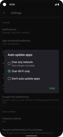 To turn on automatic update of apps using Wi-Fi, press Over Wi-Fi only.