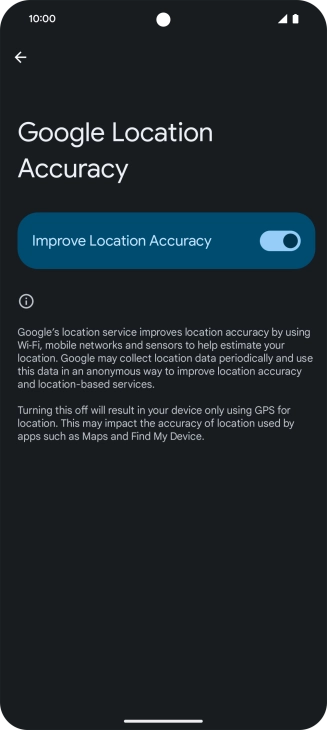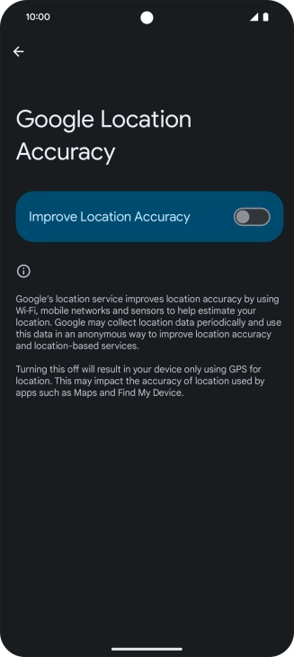 If you press the indicator next to "Improve Location Accuracy" to turn off the function, your phone can find your exact position using the GPS satellites but it may take longer as there is no access to supplementary information from the mobile network or nearby Wi-Fi networks.