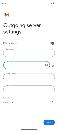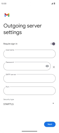 Press the indicator next to "Require sign-in" to turn the function on or off. Please note that if you're using Vodafone's outgoing server, turn off SMTP authentication and leave the username and password fields empty.