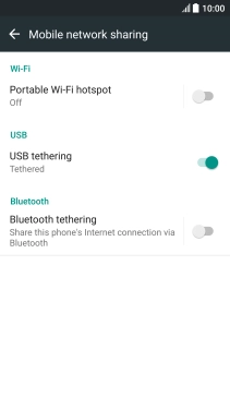 Press the indicator next to "USB tethering" to turn on the function. An internet connection from your computer via your phone is automatically established.