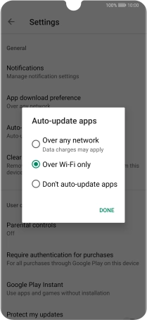 To turn on automatic update of apps using Wi-Fi, press Over Wi-Fi only.