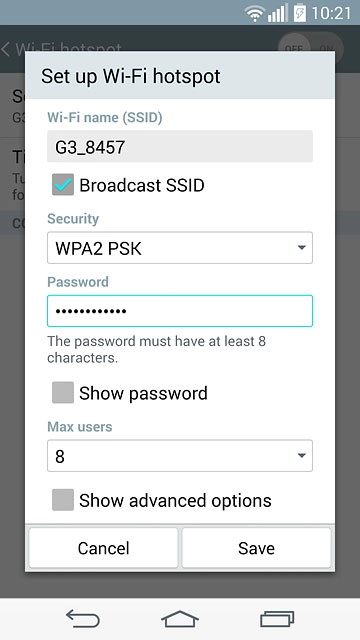 Press the field below "Wi-Fi name (SSID)" and key in the required name for the Wi-Fi hotspot.