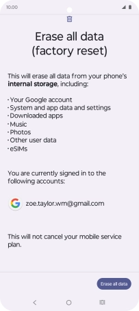 Press Erase all data. Wait a moment while the factory default settings are restored. Follow the instructions on the screen to set up your phone and prepare it for use.