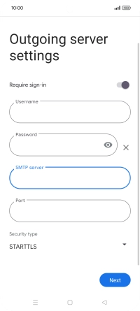 Press the indicator next to "Require sign-in" to turn the function on or off. Please note that if you're using Vodafone's outgoing server, turn off SMTP authentication and leave the username and password fields empty.