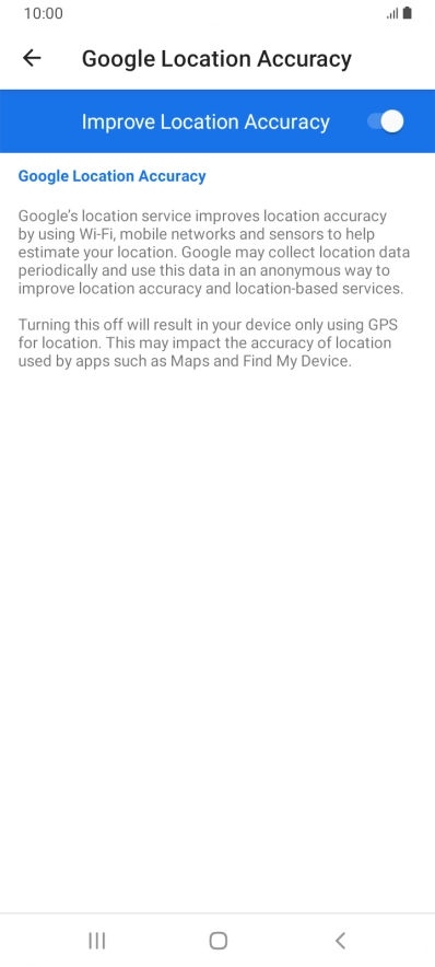 If you press the indicator next to "Improve Location Accuracy" to turn off the function, your phone can find your exact position using the GPS satellites but it may take longer as there is no access to supplementary information from the mobile network or nearby Wi-Fi networks.
