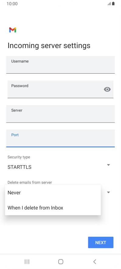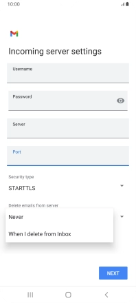 Press Never to keep email messages on the server when you delete them on your phone.