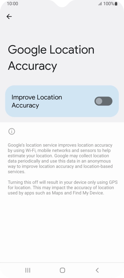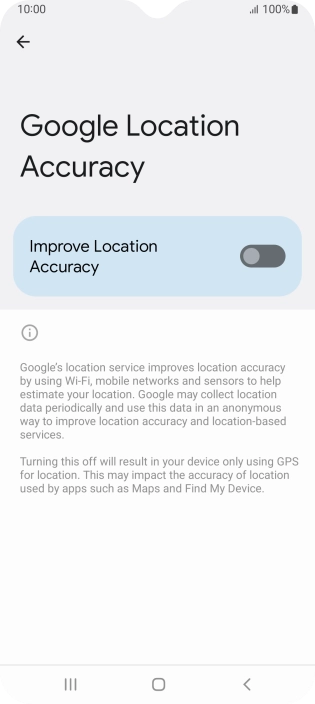 If you press the indicator next to "Improve Location Accuracy" to turn off the function, your phone can find your exact position using the GPS satellites but it may take longer as there is no access to supplementary information from the mobile network or nearby Wi-Fi networks.