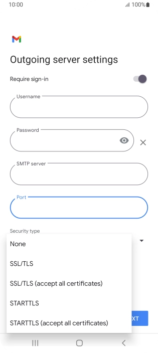 Press the indicator next to "Require sign-in" to turn the function on or off. Please note that if you're using Vodafone's outgoing server, turn off SMTP authentication and leave the username and password fields empty.