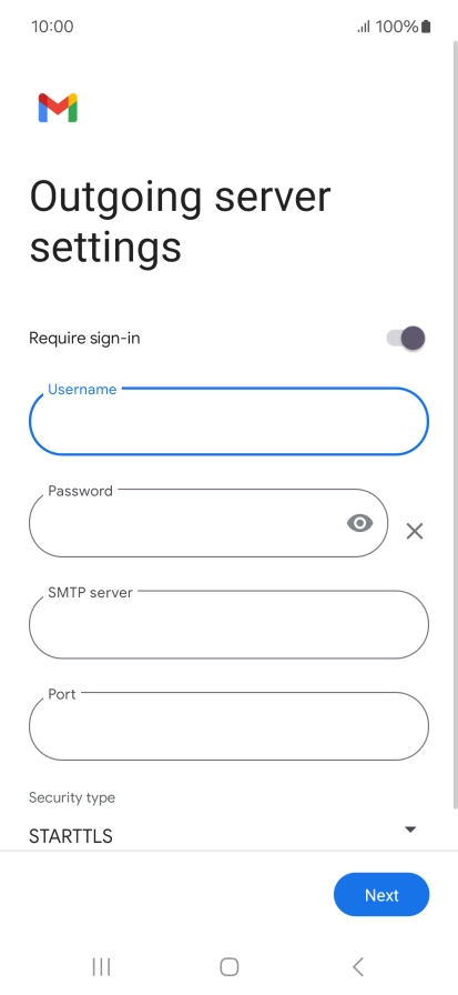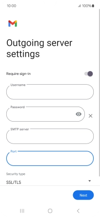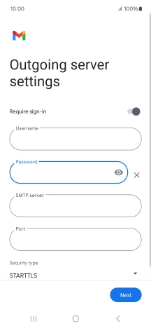 Press the indicator next to "Require sign-in" to turn the function on or off. Please note that if you're using Vodafone's outgoing server, turn off SMTP authentication and leave the username and password fields empty.