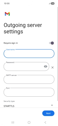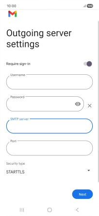 Press the indicator next to "Require sign-in" to turn the function on or off. Please note that if you're using Vodafone's outgoing server, turn off SMTP authentication and leave the username and password fields empty.