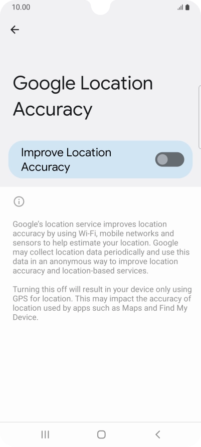 If you press the indicator next to "Improve Location Accuracy" to turn off the function, your phone can find your exact position using the GPS satellites but it may take longer as there is no access to supplementary information from the mobile network or nearby Wi-Fi networks.