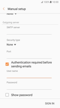 Press Authentication required before sending emails to turn the function on or off. Please note that if you're using Vodafone's outgoing server, turn off SMTP authentication and leave the username and password fields empty.