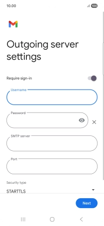 Press the indicator next to "Require sign-in" to turn the function on or off. Please note that if you're using Vodafone's outgoing server, turn off SMTP authentication and leave the username and password fields empty.