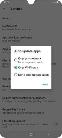 To turn on automatic update of apps using Wi-Fi, press Over Wi-Fi only.