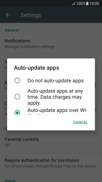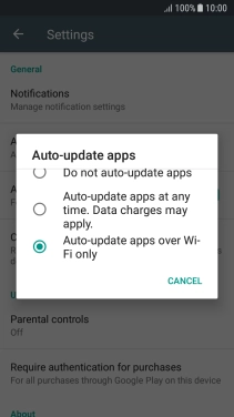 To turn on automatic update of apps using mobile network, press Auto-update apps at any time. Data charges may apply..