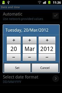 Press + or - next to day, month and year to set the date.