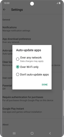 To turn on automatic update of apps using Wi-Fi, press Over Wi-Fi only.