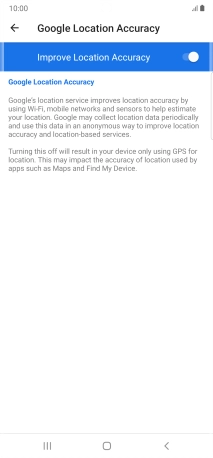 Press the indicator next to "Improve Location Accuracy" to turn off the function. If you turn off the function, your phone can find your exact position using the GPS satellites but it may take longer as there is no access to supplementary information from the mobile network or nearby Wi-Fi networks.