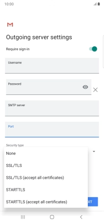 Press the indicator next to "Require sign-in" to turn the function on or off. Please note that if you're using Vodafone's outgoing server, turn off SMTP authentication and leave the username and password fields empty.