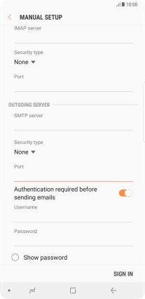 Press the indicator next to "Authentication required before sending emails" to turn the function on or off. Please note that if you're using Vodafone's outgoing server, turn off SMTP authentication and leave the username and password fields empty.