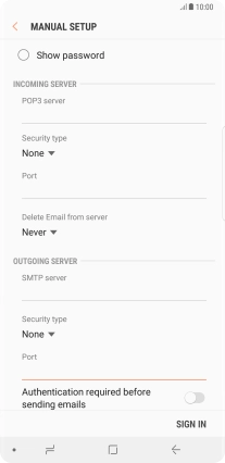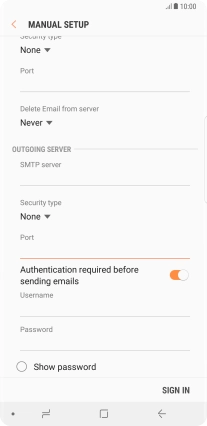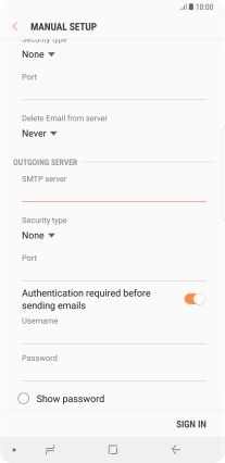 Press the indicator next to "Authentication required before sending emails" to turn the function on or off. Please note that if you're using Vodafone's outgoing server, turn off SMTP authentication and leave the username and password fields empty.
