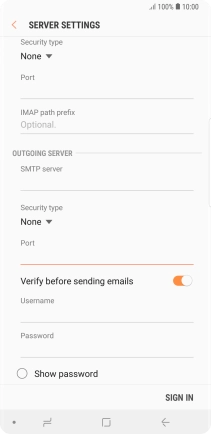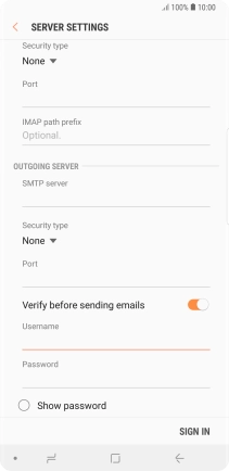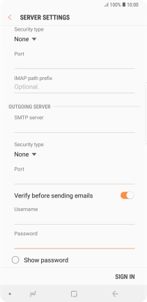 Press the indicator next to "Verify before sending emails" to turn the function on or off. Please note that if you're using Vodafone's outgoing server, turn off SMTP authentication and leave the username and password fields empty.