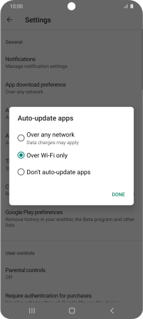 To turn on automatic update of apps using Wi-Fi, press Over Wi-Fi only.