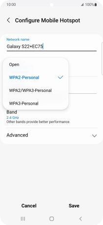 Press WPA3-Personal to password protect your Wi-Fi hotspot.
