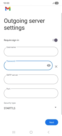 Press the indicator next to "Require sign-in" to turn the function on or off. Please note that if you're using Vodafone's outgoing server, turn off SMTP authentication and leave the username and password fields empty.